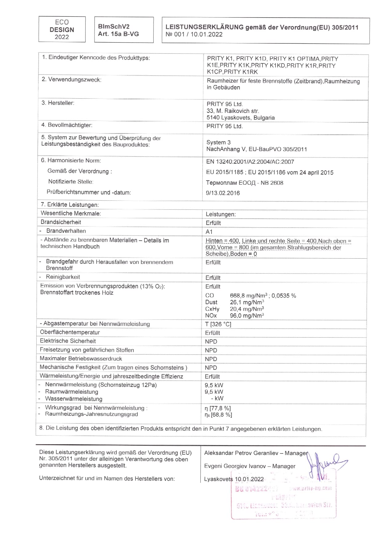 - Erf. Förderdruck bei Nennwärmeleistung: 12 Pa / Mittl. CO-Gehalt der Abgase bezogen auf 13% O2: 0,0535 % / Feinstaub: 26,11 mg/Nm3